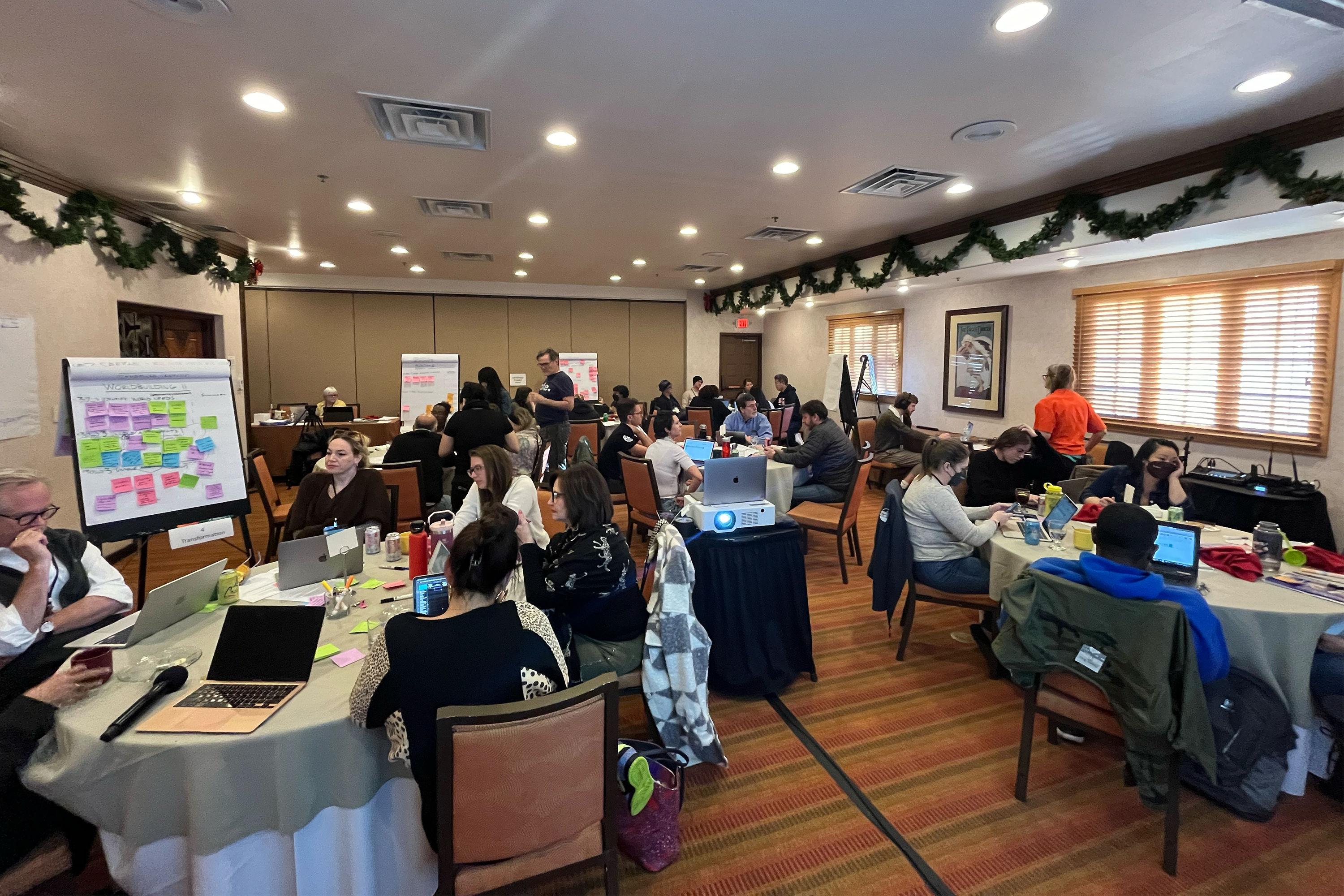 An overview of all the participating groups engaging in exercises and discussions for a second round of World Building with a layer of projections added in such as demographic shifts, climate change, and the future of work.